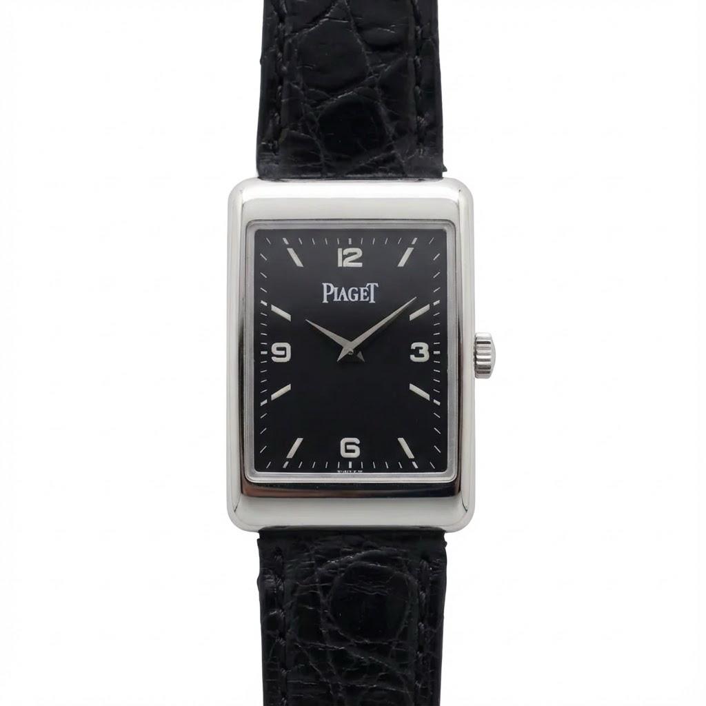 The Piaget A L’Ancienne is a refined rectangular dress watch showcasing Piaget’s signature elegance. Its sleek black dial features minimalist baton hour markers paired with numerals at 12, 3, 6, and 9, creating a clean and balanced layout. Slim dauphine hands enhance legibility while maintaining a sophisticated aesthetic. The polished rectangular case embodies classic Piaget styling with smooth contours and a vintage-inspired silhouette. Paired with a textured black leather strap, the watch exudes understated luxury. Timeless, slim, and versatile, it is an excellent choice for collectors seeking a tasteful, heritage-driven Piaget manual winding dress watch.