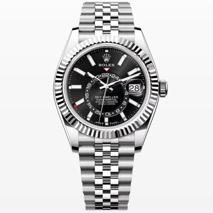 The Rolex Sky-Dweller with a black dial is a masterpiece of modern horological engineering, designed for those who navigate global lifestyles with precision and style. Crafted in robust Oystersteel and paired with a luxurious Jubilee bracelet, this model offers both durability and exceptional comfort. Its deep black dial enhances readability, featuring a dual-time 24-hour ring and an innovative annual calendar with the month indicator positioned subtly around the perimeter. The fluted white-gold bezel adds classic Rolex elegance while housing the Ring Command system, allowing effortless adjustment of all complications. Combining sophistication, technical brilliance, and a bold contemporary presence, the Sky-Dweller stands as one of Rolex’s most advanced and desirable timepieces.