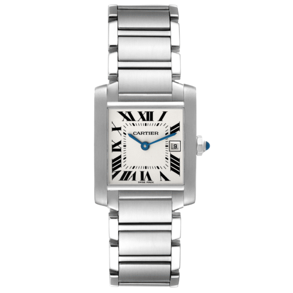 The Cartier Tank Française is an enduring symbol of Parisian elegance, blending refined geometry with unmistakable Cartier heritage. Its steel rectangular case follows the clean, architectural lines inspired by early 20th-century design, offering a sophisticated presence on the wrist. The silvered dial features bold black Roman numerals, railroad-style minute track, and Cartier’s iconic blued-steel sword hands—details that enhance both legibility and classic charm. A discreet date window at 3 o’clock adds daily practicality. The integrated stainless-steel bracelet flows seamlessly into the case, providing a comfortable and modern silhouette. Powered by Cartier’s reliable movement, the Tank Française remains a timeless choice for collectors and enthusiasts who appreciate understated luxury and iconic design.